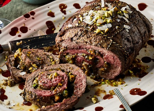 - Bak de rollade rondom aan; de bavette moet bruin zijn, maar hoeft niet te garen.